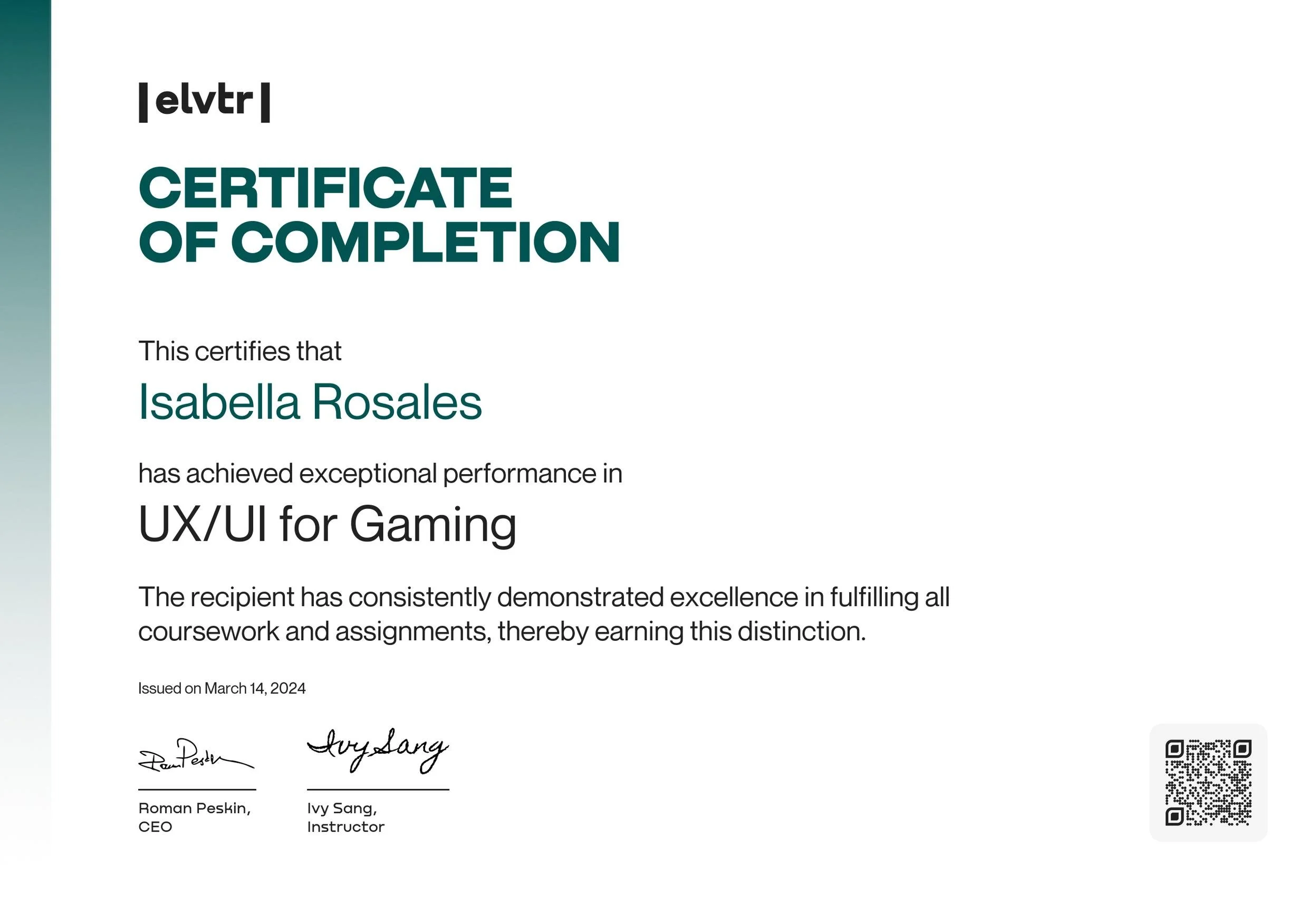I wanted to better understand how UX translates into the market of gaming infrastructures and obtained a certificate in gaming UX in 2024.